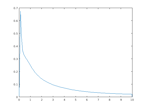 ksdensity использует граничный метод коррекции, когда вы задаете или положительный или ограниченный носитель. Граничный метод коррекции по умолчанию является логарифмическим преобразованием. Когда ksdensity преобразовывает поддержку назад, она вводит 1/x термин в средстве оценки плотности ядра. Поэтому оценка имеет пик около x = 0. С другой стороны, отражательный метод не вызывает нежелательный peaks около контура.