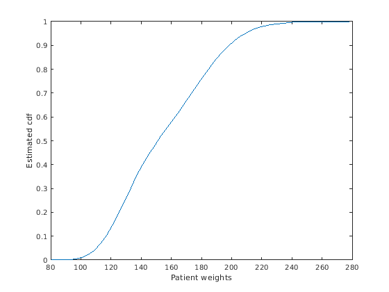 figure() ksdensity(hospital.Weight,'Support','positive','Function','cdf',... 'NumPoints',50) xlabel('Patient weights') ylabel('Estimated cdf')
