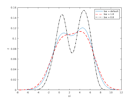 [f,xi] = ksdensity(x,'Bandwidth',0.8); plot(xi,f,'-.k','LineWidth',1.5) legend('bw = default','bw = 1.8','bw = 0.8') hold off