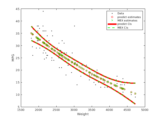 h1 = plot(X,y,'k.'); hold on h2 = plot(Xnew,yhat1,'ro',Xnew,yhat2,'gx'); h3 = plot(Xnew,ci1,'r-','LineWidth',4); h4 = plot(Xnew,ci2,'g--','LineWidth',2); legend([h1; h2; h3(1); h4(1)], ... {'Data','predict estimates','MEX estimates','predict CIs','MEX CIs'}); xlabel('Weight'); ylabel('MPG');