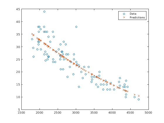 plot(X,y,'o',X,ypred,'x') legend('Data','Predictions')