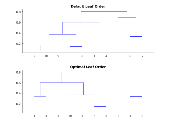 возвращает оптимальное листовое упорядоченное расположение для иерархического бинарного кластерного дерева, leafOrder = optimalleaforder(tree,D)tree, с помощью расстояний, D. Оптимальное листовое упорядоченное расположение двоичного дерева максимизирует сумму общих черт между смежными листами путем зеркального отражения древовидных ветвей, не деля кластеры.