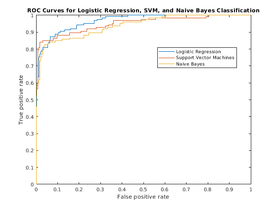 plot(Xlog,Ylog) hold on plot(Xsvm,Ysvm) plot(Xnb,Ynb) legend('Logistic Regression','Support Vector Machines','Naive Bayes','Location','Best') xlabel('False positive rate'); ylabel('True positive rate'); title('ROC Curves for Logistic Regression, SVM, and Naive Bayes Classification') hold off