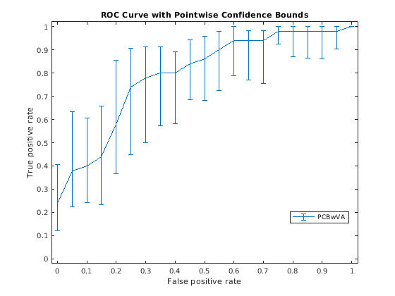Если perfcurve вычисляет доверительные границы с помощью вертикального усреднения, AUC вектор 3 на 1. Первый столбец AUC содержит среднее значение. Вторые и третьи столбцы содержат нижнюю границу и верхнюю границу, соответственно, доверительной границы.
