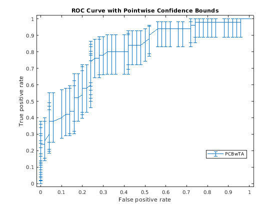 Когда вы вычисляете доверительные границы, Y m-by-3 массив, где m является количеством фиксированного X значения или пороги (T значения. Первый столбец Y содержит среднее значение. Вторые и третьи столбцы содержат нижнюю границу и верхнюю границу, соответственно, pointwise доверительных границ. AUC вектор-строка с тремя элементами, в соответствии с тем же соглашением. Если perfcurve вычисляет доверительные границы с помощью ВА, затем T m-by-3 матрица и X вектор-столбец. Если perfcurve TA использования, затем X m-by-3 матрица и T вектор-столбец.
