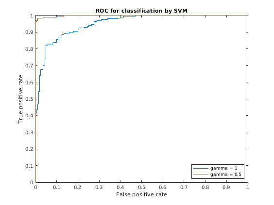 plot(x1,y1) hold on plot(x2,y2) hold off legend('gamma = 1','gamma = 0.5','Location','SE'); xlabel('False positive rate'); ylabel('True positive rate'); title('ROC for classification by SVM');