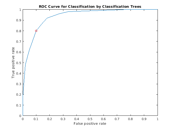 [X,Y,T,~,OPTROCPT,suby,subnames] = perfcurve(species,diffscore,'versicolor');X, по умолчанию, ложный положительный уровень (осадки или 1 специфика) и Y, по умолчанию, истинный положительный уровень (отзыв или чувствительность). Положительной меткой класса является versicolor. Поскольку отрицательный класс не задан, perfcurve принимает, что наблюдения, которые не принадлежат положительному классу, находятся в одном классе. Функция принимает его как отрицательный класс.