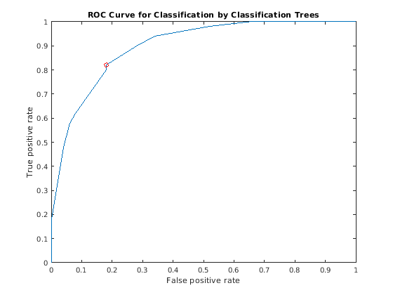 perfcurve затем находит оптимальную рабочую точку путем перемещения прямой линии с наклонным S от левого верхнего угла графика ROC (FPR = 0, TPR = 1) вниз и направо, пока это не пересекает кривую ROC.