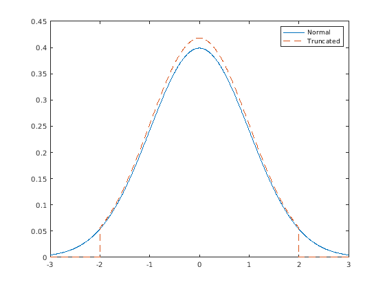 x = linspace(-3,3,1000); figure plot(x,pdf(pd,x)) hold on plot(x,pdf(t,x),'LineStyle','--') legend('Normal','Truncated') hold off