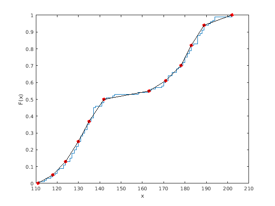 x | Вектор значений x, в которых cdf изменяет наклон |