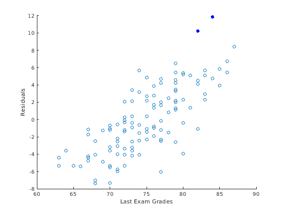 В отличие от regress, fitlm функция не требует столбца из единиц во входных данных. Модель создается fitlm всегда включает термин прерывания, если вы не задаете, чтобы не включать его при помощи 'Intercept' аргумент пары "имя-значение".