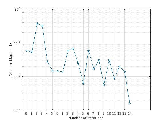 semilogy(UpdatedFitInfo.History.GradientMagnitude,'o-') ax = gca; ax.XTick = 1:21; ax.XTickLabel = UpdatedFitInfo.History.IterationNumber; grid on xlabel('Number of Iterations') ylabel('Gradient Magnitude')
