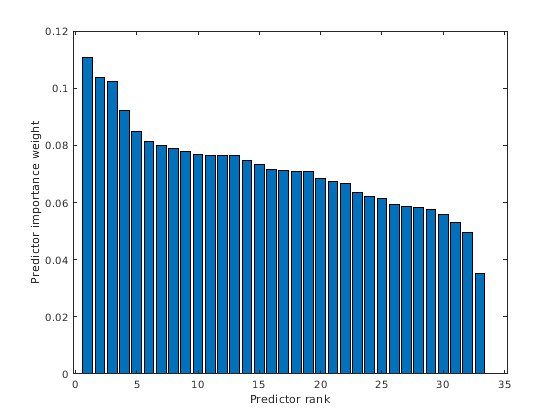 [ предикторы рангов с помощью или алгоритма ReliefF или RReliefF с idx,weights] = relieff(X,y,k)k самые близкие соседи. Входная матрица X содержит переменные предикторы и векторный y содержит вектор отклика. Функция возвращает idx, который содержит индексы самых важных предикторов и weights, который содержит веса предикторов.