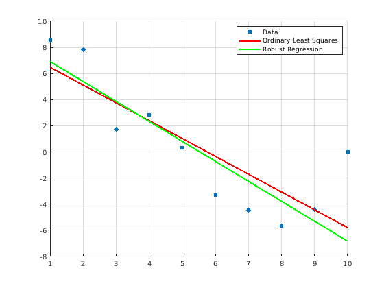 b = robustfit(X,y, средства управления, будет ли модель включать постоянный термин. wfun,tune,const)const 'on' включать постоянный термин (значение по умолчанию), или 'off' не использовать его. Когда const 'on', robustfit добавляет первый столбец 1 с к X и b становится (p + 1)-by-1 вектор. Когда const 'off', robustfit не изменяет X, затем b p-by-1 вектор.