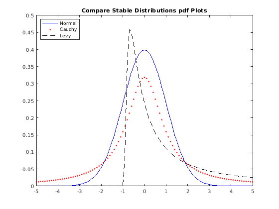 pd_norm = makedist('Stable','alpha',2,'beta',0,'gam',1/sqrt(2),'delta',0); pd_cauchy = makedist('Stable','alpha',1,'beta',0,'gam',1,'delta',0); pd_levy = makedist('Stable','alpha',0.5,'beta',1,'gam',1,'delta',0);