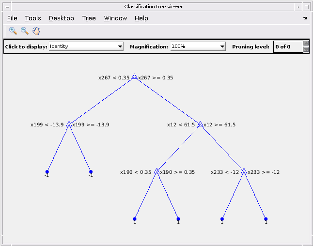 Если вы задаете Method быть повышающим алгоритмом и Learners чтобы быть деревьями решений, затем программное обеспечение выращивает stumps по умолчанию. Пень решения является одним корневым узлом, соединенным с двумя терминалами, вершинами. Можно настроить древовидную глубину путем определения MaxNumSplits, MinLeafSize, и MinParentSize аргументы пары "имя-значение" с помощью templateTree.