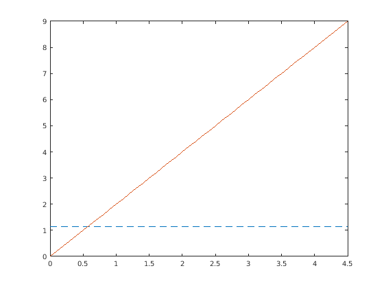 t = 0:0.1:4.5; h1 = exppdf(t,0.8862)./(1-expcdf(t,0.8862)); h2 = wblpdf(t,1,2)./(1-wblcdf(t,1,2)); plot(t,h1,'--',t,h2,'-')