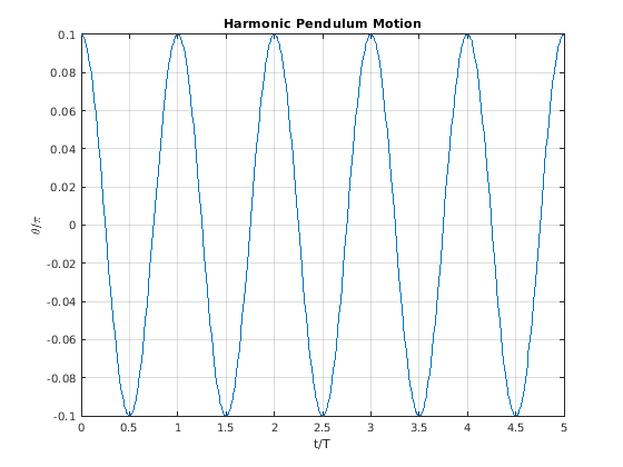 fplot(thetaSolPlot(t*T)/pi, [0 5]); grid on; title('Harmonic Pendulum Motion'); xlabel('t/T'); ylabel('\theta/\pi');