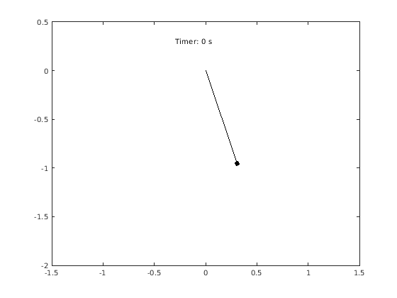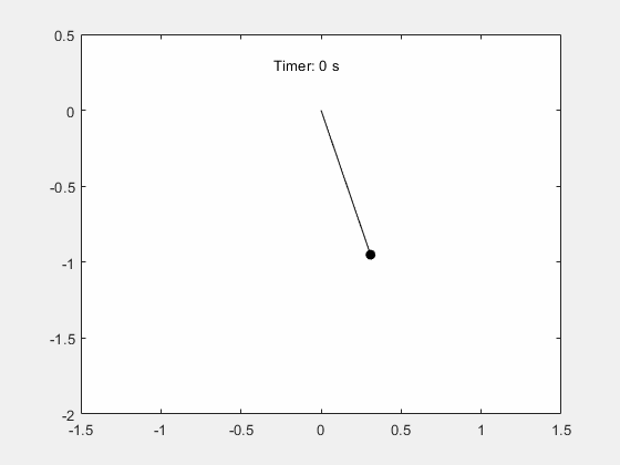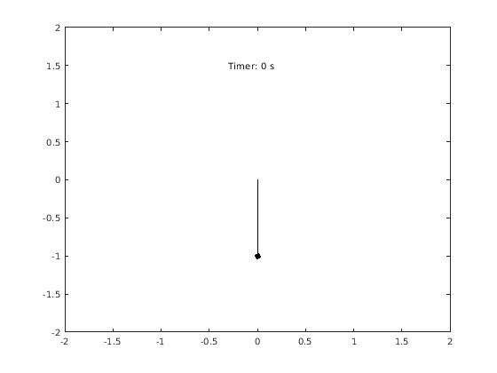 x_pos = @(t) sin(deval(sols,t,1)); y_pos = @(t) -cos(deval(sols,t,1)); figure; fanimator(@(t) plot(x_pos(t),y_pos(t),'ko','MarkerFaceColor','k')); hold on; fanimator(@(t) plot([0 x_pos(t)],[0 y_pos(t)],'k-')); fanimator(@(t) text(-0.3,1.5,"Timer: "+num2str(t,2)+" s"));