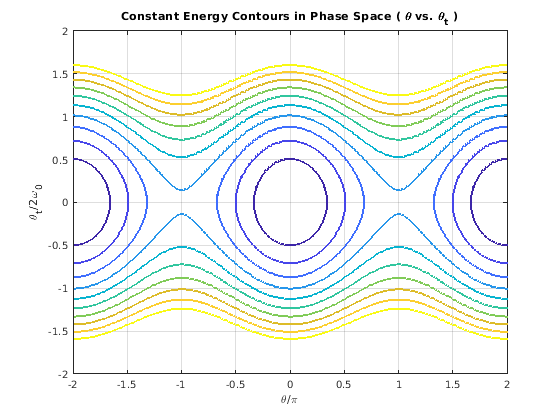 syms theta theta_t omega_0 E(theta, theta_t, omega_0) = (1/2)*(theta_t^2+(2*omega_0*sin(theta/2))^2); Eplot(theta, theta_t) = subs(E,omega_0,omega_0Value); figure; fc = fcontour(Eplot(pi*theta, 2*omega_0Value*theta_t), 2*[-1 1 -1 1], ... 'LineWidth', 2, 'LevelList', 0:5:50, 'MeshDensity', 1+2^8); grid on; title('Constant Energy Contours in Phase Space ( \theta vs. \theta_t )'); xlabel('\theta/\pi'); ylabel('\theta_t/2\omega_0');