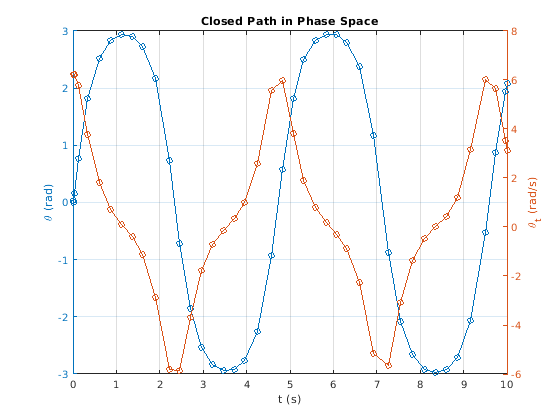 figure; yyaxis left; plot(sols.x, sols.y(1,:), '-o'); ylabel('\theta (rad)'); yyaxis right; plot(sols.x, sols.y(2,:), '-o'); ylabel('\theta_t (rad/s)'); grid on; title('Closed Path in Phase Space'); xlabel('t (s)');