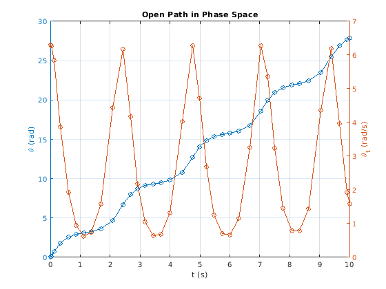 figure; yyaxis left; plot(sols.x, sols.y(1,:), '-o'); ylabel('\theta (rad)'); yyaxis right; plot(sols.x, sols.y(2,:), '-o'); ylabel('\theta_t (rad/s)'); grid on; title('Open Path in Phase Space'); xlabel('t (s)');