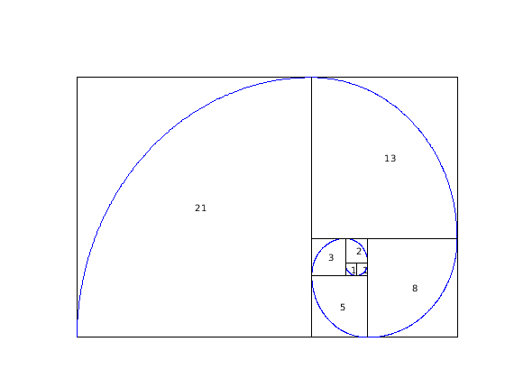 x = 0; y = 1; syms v u axis off hold on for n = 1:8 a = fibonacci(n); % Define squares and arcs switch mod(n,4) case 0 y = y - fibonacci(n-2); x = x - a; eqnArc = (u-(x+a))^2 + (v-y)^2 == a^2; case 1 y = y - a; eqnArc = (u-(x+a))^2 + (v-(y+a))^2 == a^2; case 2 x = x + fibonacci(n-1); eqnArc = (u-x)^2 + (v-(y+a))^2 == a^2; case 3 x = x - fibonacci(n-2); y = y + fibonacci(n-1); eqnArc = (u-x)^2 + (v-y)^2 == a^2; end % Draw square pos = [x y a a]; rectangle('Position', pos) % Add Fibonacci number xText = (x+x+a)/2; yText = (y+y+a)/2; text(xText, yText, num2str(a)) % Draw arc interval = [x x+a y y+a]; fimplicit(eqnArc, interval, 'b') end