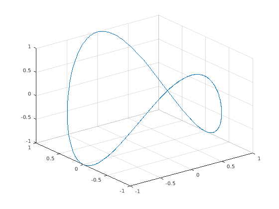 syms x(t) y(t) z(t) x(t) = sin(t); y(t) = cos(t); z(t) = cos(2*t); fplot3(x,y,z)