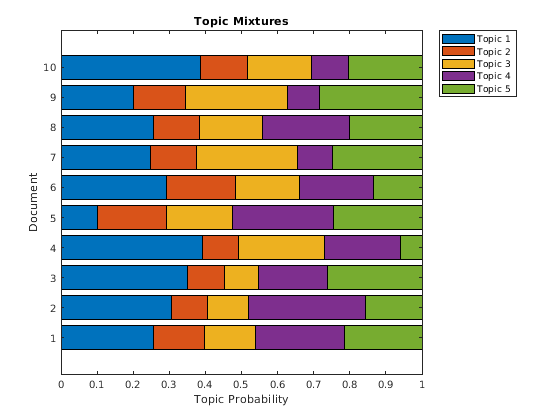 topicMixtures = transform(mdl,documents(1:10)); figure barh(topicMixtures,'stacked') xlim([0 1]) title("Topic Mixtures") xlabel("Topic Probability") ylabel("Document") legend("Topic " + string(1:numTopics),'Location','northeastoutside')