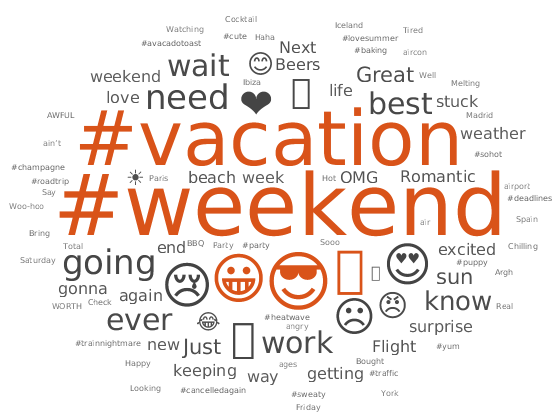 Визуализируйте эмодзи, одним словом, облако путем извлечения лексем с типом маркера "emoji" и введение их в wordcloud функция.