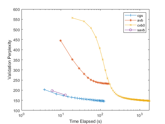 numTopics = 60; solvers = ["cgs" "avb" "cvb0" "savb"]; lineSpecs = ["+-" "*-" "x-" "o-"];