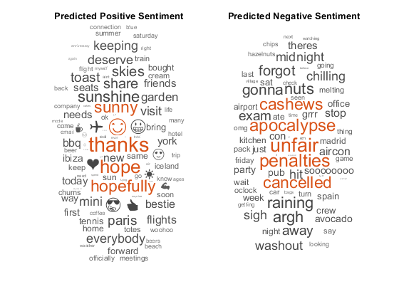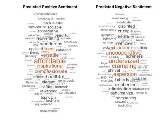 figure subplot(1,2,1) idx = YPred == "Positive"; wordcloud(wordsTest(idx),scores(idx,1)); title("Predicted Positive Sentiment") subplot(1,2,2) wordcloud(wordsTest(~idx),scores(~idx,2)); title("Predicted Negative Sentiment")