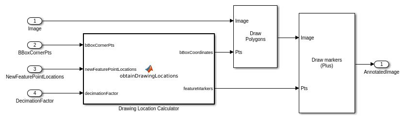 Этот пример использует блок From Multimedia File, чтобы считать видеокадры из видеофайла. Detection and Tracking подсистема берет в видеокадре и обеспечивает ограничительную рамку для поверхности и характерных точек в ограничительной рамке как ее выход к Draw Annotations подсистема. Эта подсистема вставляет в изображение прямоугольник для ограничительной рамки и маркеры для характерных точек.