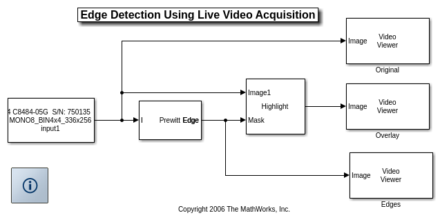 В этом примере показано, как использовать блок From Video Device, обеспеченный Image Acquisition Toolbox™, чтобы передавать живые изображения от камеры Хамамацу C8484 в Simulink®. Метод Prewitt применяется, чтобы найти ребра объектов во входном видеопотоке.