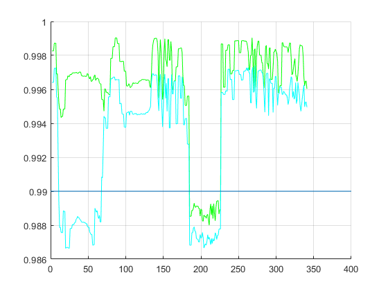 while ~isDone(hVideoSrc) Im = step(hVideoSrc); % Reduce the image size to speed up processing Im_gp = multilevelPyramid(Im, level); % Frequency domain convolution. Im_p(1:ri, 1:ci) = Im_gp; % Zero-pad img_fft = fft2(Im_p); corr_freq = img_fft .* target_fft; corrOutput_f = ifft2(corr_freq); corrOutput_f = corrOutput_f(rt:ri, ct:ci); % Calculate image energies and block run tiles that are size of % target template. IUT_energy = (Im_gp).^2; IUT = conv2(IUT_energy, C_ones, 'valid'); IUT = sqrt(IUT); % Calculate normalized cross correlation. norm_Corr_f = (corrOutput_f) ./ (IUT * target_energy); xyLocation = step(hFindMax, norm_Corr_f); % Calculate linear indices. linear_index = sub2ind([ri-rt, ci-ct]+1, xyLocation(:,2),... xyLocation(:,1)); norm_Corr_f_linear = norm_Corr_f(:); norm_Corr_value = norm_Corr_f_linear(linear_index); detect = (norm_Corr_value > threshold); target_roi = zeros(length(detect), 4); ul_corner = (gain.*(xyLocation(detect, :)-1))+1; target_roi(detect, :) = [ul_corner, fliplr(target_size(detect, :))]; % Draw bounding box. Imf = insertShape(Im, 'Rectangle', target_roi, 'Color', 'green'); % Plot normalized cross correlation. videopatternplots('update',hPlot,norm_Corr_value); step(hROIPattern, Imf); end snapnow release(hVideoSrc); % Function to compute pyramid image at a particular level. function outI = multilevelPyramid(inI, level) I = inI; outI = I; for i=1:level outI = impyramid(I, 'reduce'); I = outI; end end