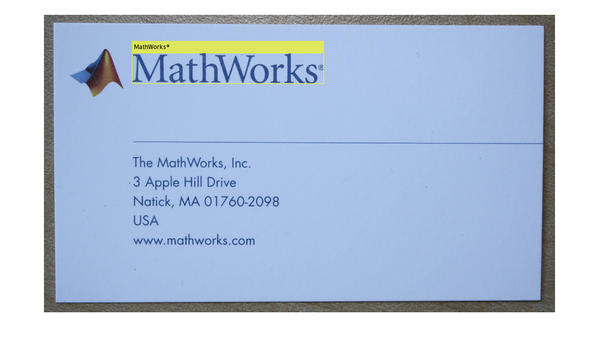 % Load an image. I = imread('businessCard.png'); % Perform OCR. results = ocr(I); % Display one of the recognized words. word = results.Words{2}