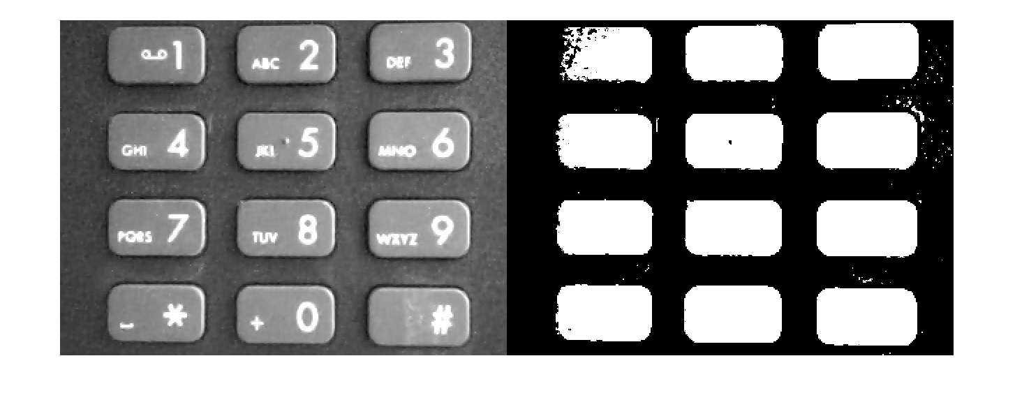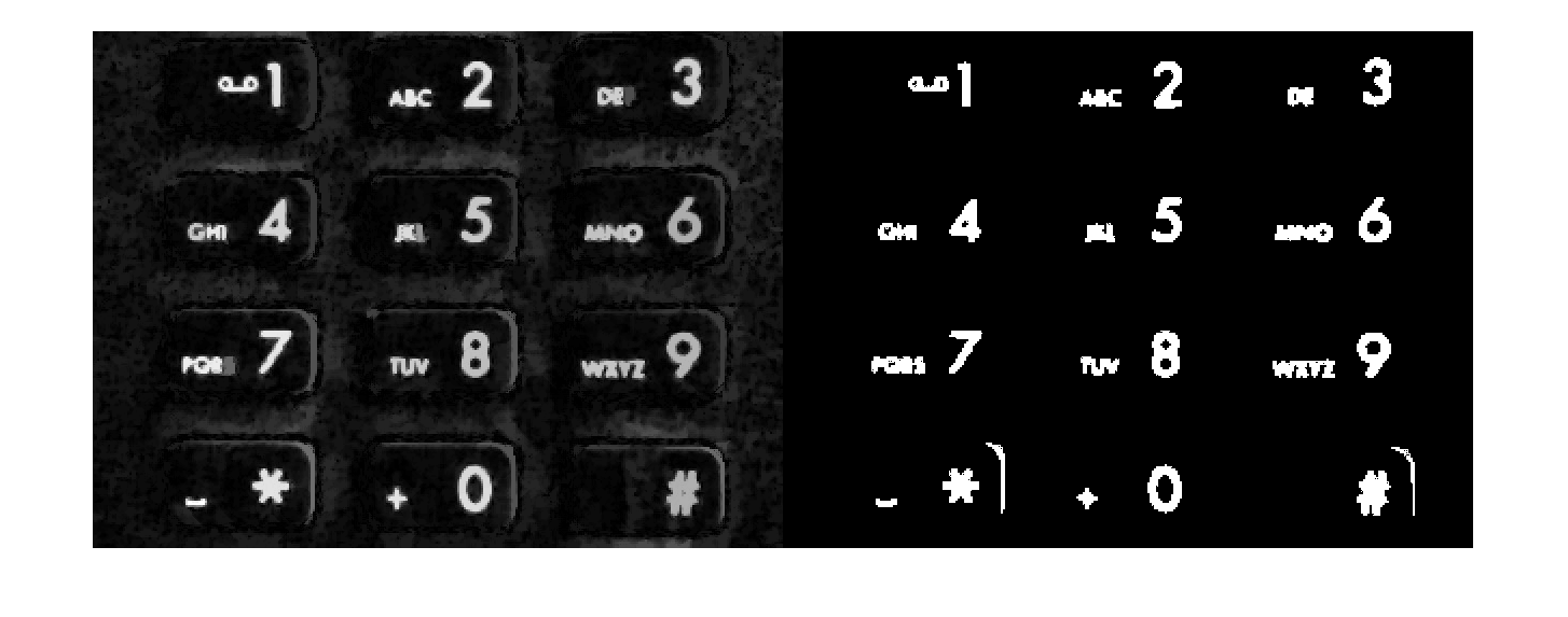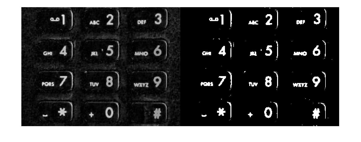 % Remove keypad background. Icorrected = imtophat(I,strel('disk',15)); BW1 = imbinarize(Icorrected); figure; imshowpair(Icorrected,BW1,'montage');
