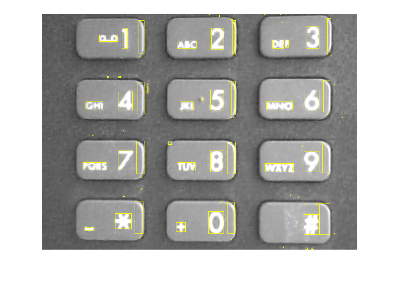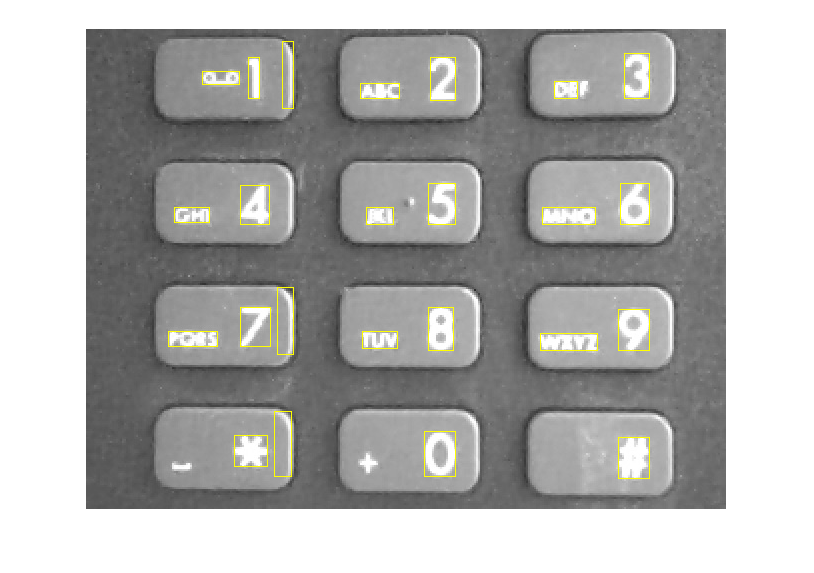 В некоторых ситуациях, только предварительно обработав изображение может не быть достаточным, чтобы достигнуть хороших результатов OCR. Один подход, чтобы использовать в этой ситуации, должен идентифицировать определенные области в изображении что ocr должен обработать. В изображении клавиатуры в качестве примера эти области были бы теми, которые только содержат цифры. Можно выбрать области вручную с помощью imrect, или можно автоматизировать процесс. Один метод для автоматизации текстового обнаружения дан в примере, названном, Автоматически Обнаруживают и Распознают текст в Естественных Изображениях. В этом примере вы будете использовать vision.BlobAnalysis найти цифры на клавиатуре.
