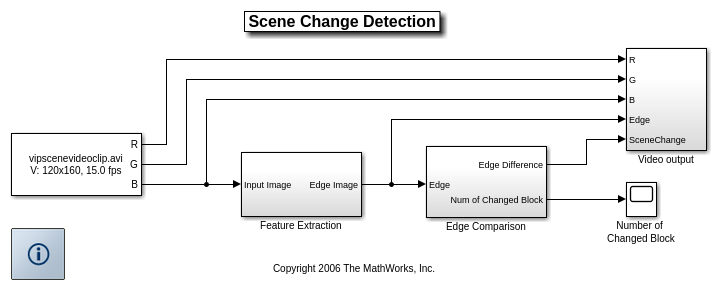 Сегменты модели видео с помощью следующих шагов. Во-первых, это находит ребра в двух последовательных видеокадрах, который делает алгоритм менее чувствительным к небольшим изменениям. На основе этих ребер модель использует блок Block Processing, чтобы сравнить разделы видеокадров друг другу. Если количество различных разделов превышает заданный порог, пример решает, что сцена изменилась.