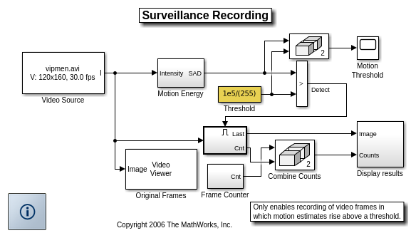 Пример использует блок Template Matching, чтобы обнаружить движение в видео последовательности. Когда Сумма Абсолютных разностей (SAD), значение конкретной системы координат превышает порог, пример, записывает этот видеокадр и отображает его в окне Motion Frames.