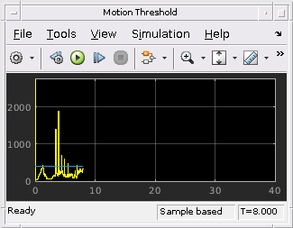 Окно Motion Threshold отображает пороговое значение синего цвета, и строит значения SAD для каждой системы координат желтого цвета. Любое время значение SAD превышает порог, модель, записывает видеокадр.
