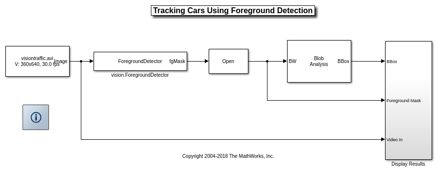 Следующий рисунок показывает модель Tracking Cars Using Foreground Detection: