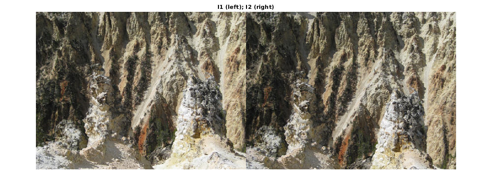 I1 = imread('yellowstone_left.png'); I2 = imread('yellowstone_right.png'); % Convert to grayscale. I1gray = rgb2gray(I1); I2gray = rgb2gray(I2);