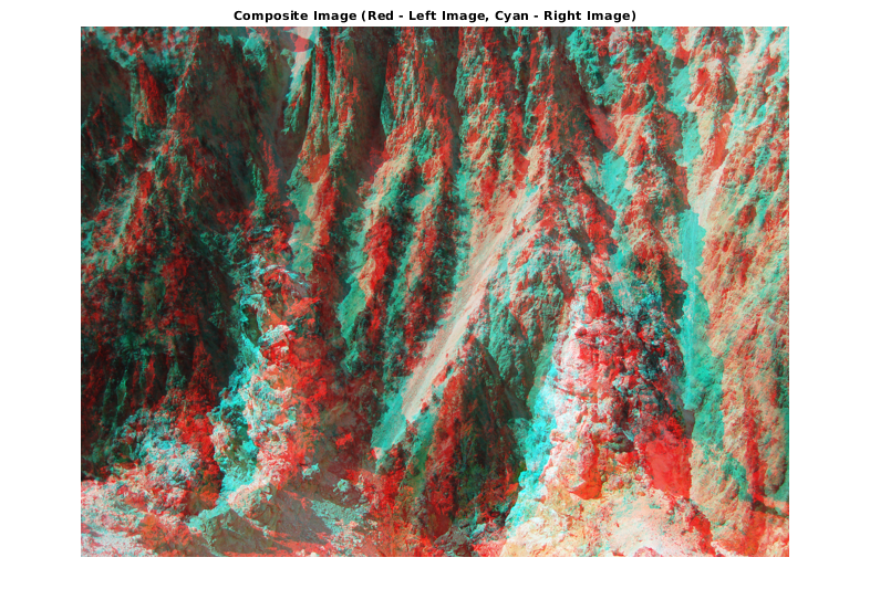figure; imshowpair(I1, I2,'montage'); title('I1 (left); I2 (right)'); figure; imshow(stereoAnaglyph(I1,I2)); title('Composite Image (Red - Left Image, Cyan - Right Image)');