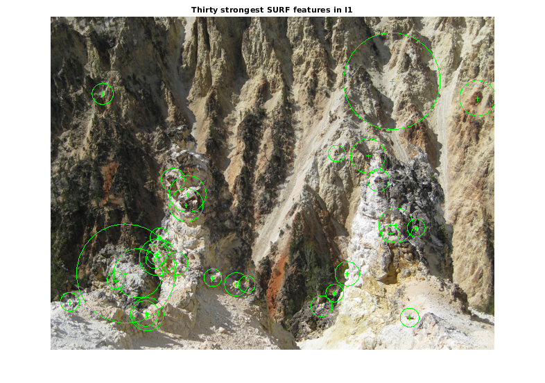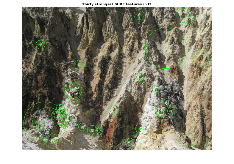 figure; imshow(I1); hold on; plot(selectStrongest(blobs1, 30)); title('Thirty strongest SURF features in I1'); figure; imshow(I2); hold on; plot(selectStrongest(blobs2, 30)); title('Thirty strongest SURF features in I2');