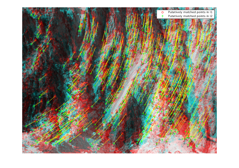 figure; showMatchedFeatures(I1, I2, matchedPoints1, matchedPoints2); legend('Putatively matched points in I1', 'Putatively matched points in I2');