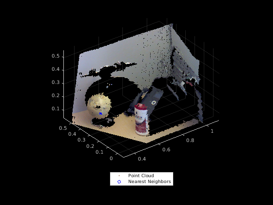[ возвращает K - ближайших соседей точки запроса в облаке точки ввода. Облако точки ввода является организованными данными об облаке точек, сгенерированными камерой глубины. K - ближайших соседей точки запроса определяются с помощью быстро аппроксимированный алгоритм поиска K - ближайших соседей. Функция использует матрицу проекции камеры indices,dists] = findNearestNeighbors(ptCloud,point,K,camMatrix)camMatrix чтобы знать отношение между смежными точками и следовательно, ускоряет самый близкий соседний поиск. Однако результаты имеют более низкую точность по сравнению с основанным на Kd-дереве подходом.