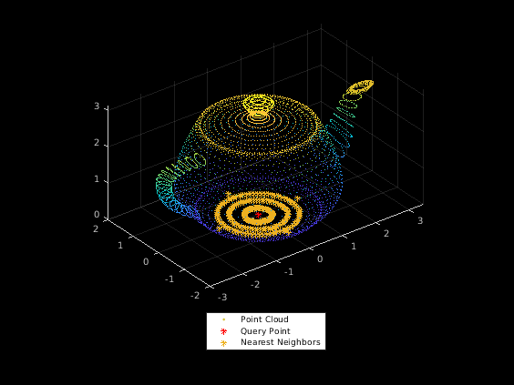 [ возвращает K - ближайших соседей точки запроса в облаке точки ввода. Облако точки ввода может быть неорганизованными или организованными данными об облаке точек. K - ближайших соседей точки запроса вычисляются при помощи основанного на Kd-дереве алгоритма поиска. indices,dists] = findNearestNeighbors(ptCloud,point,K)
