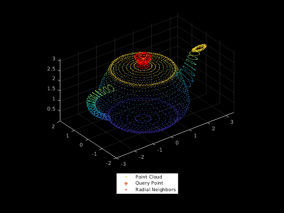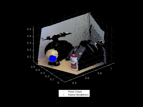 [ возвращает соседей в радиусе точки запроса в облаке точки ввода. Облако точки ввода может быть неорганизованными или организованными данными об облаке точек. Соседи в радиусе точки запроса вычисляются при помощи основанного на Kd-дереве алгоритма поиска.indices,dists] = findNeighborsInRadius(ptCloud,point,radius)