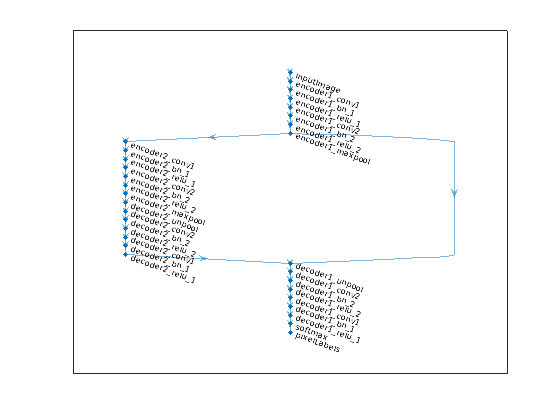 возвращается неинициализированные слои SegNet сконфигурировали использование заданной глубины энкодера.lgraph = segnetLayers(imageSize,numClasses,encoderDepth)